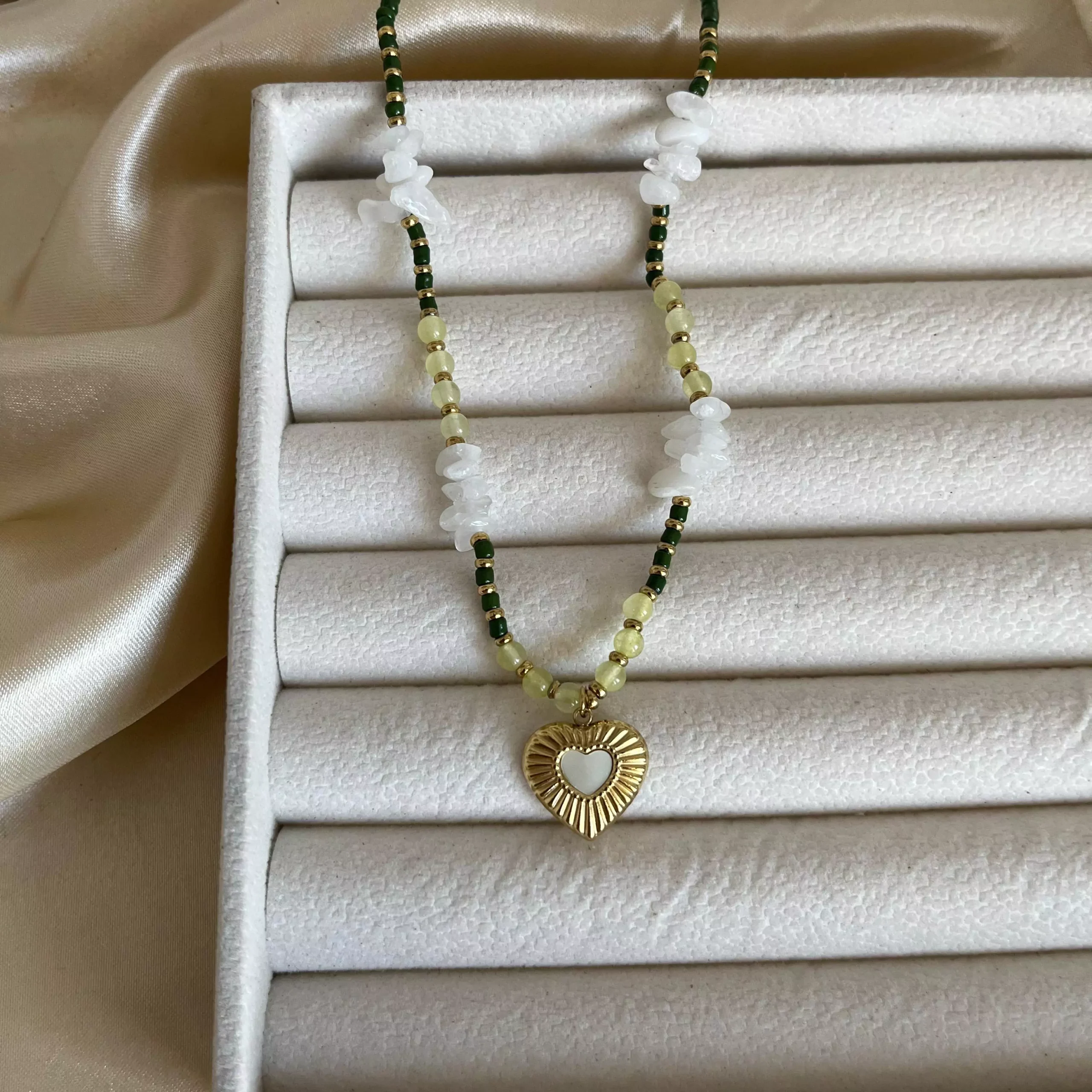 Be the first to review “White Heart Green beads Necklace” Cancel reply